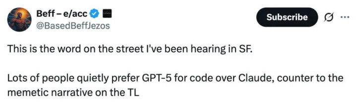 粉丝近 20 万的推特大 V、e/acc 思潮创始人表示,根据他在旧金山听到的一些「小道消息」,现在很多人私下里其实更喜欢用 GPT-5 来写代码,这和流行的「Claude 更擅长编程」的叙事恰恰相反。