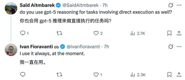不仅如此,他在需要直接执行的任务中同样在用 GPT-5 reasoning。