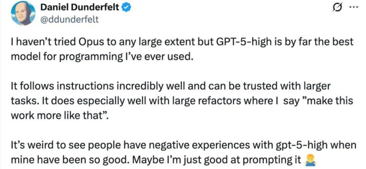 一位全栈产品开发者表示,「GPT-5-high 是目前为止他用过的最好的编程模型。」