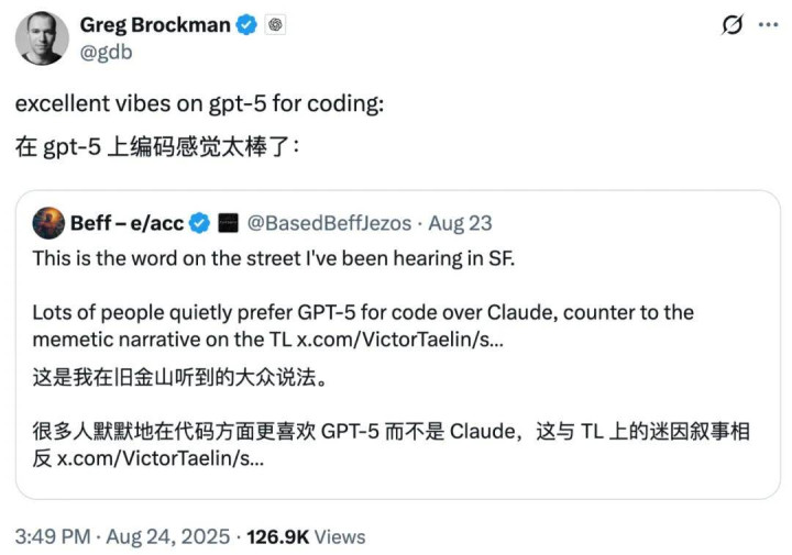 看到自家模型受到了越来越多人的喜爱,OpenAI 联合创始人兼总裁 Greg Brockman「坐不住」了,发推自夸道「用 GPT-5 写代码感觉太棒了」。