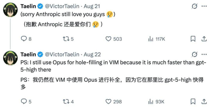 不过,他也表示自己依然热爱 Anthropic,并在 VIM 编辑器中使用 Opus 进行代码补全,速度要比 GPT-5-high 快得多。
