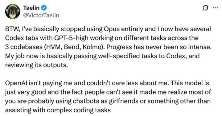 有人发帖称,他基本已经完全不用 Claude Opus 了。现在同时开着几个 Codex 标签页,让 GPT-5-high 分别在三个代码库(HVM、Bend、Kolmo)上处理不同的任务。AI 编程进展从未如此迅速。他的工作基本上就是将定义清晰的任务交给 Codex,然后审查代码输出。