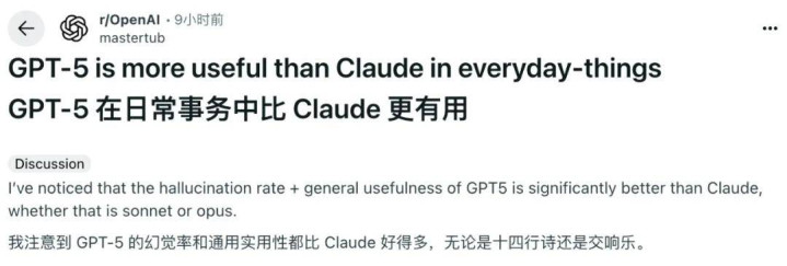 从这些人的反馈来看,GPT-5 编程能力更强似乎已经成为了一个不争的事实。与此同时,reddit 社区今天有一个帖子提到,「GPT-5 的幻觉率和通用实用性显著优于 Claude。」