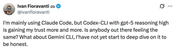 另一位推特博主、CoreView 联合创始人兼 CTO Ivan Fioravanti 也表示,他现在主要用 Claude Code,但 Codex-CLI 搭配 GPT-5 reasoning high 逐渐获得了他的更多信任。至于谷歌的 Gemini CLI,他都没开始深入研究。