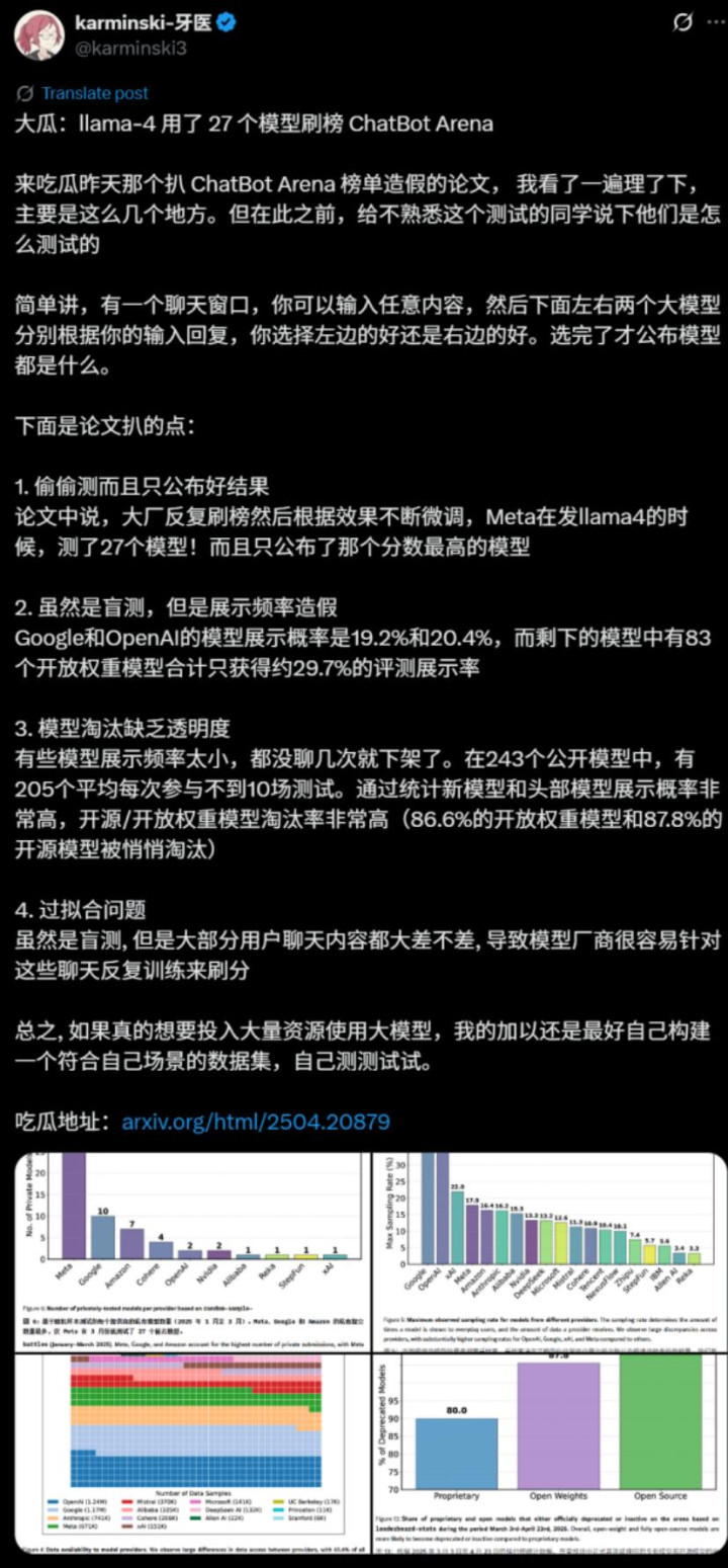 但是,随着时间的推移到了Llama 4的时候,市场上开始出现对其性能指标的质疑。一些第三方评测机构和社区开发者发现,Llama 4在某些公开基准测试中得分很高,但在实际应用中的表现却不尽如人意,其真实能力似乎未能达到宣传的水平。有传闻指出,该模型可能在训练过程中针对特定的评测基准进行了过度优化,以求在排行榜上获得一个好看的数字。这种做法被批评为一种“应试教育”式的开发,甚至是一种数据造假。