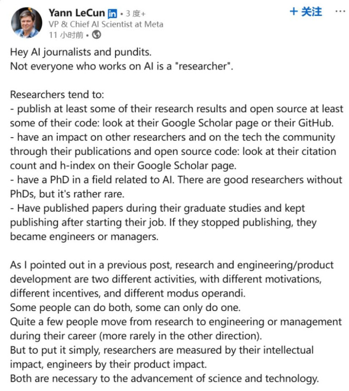 LeCun继续写道:“正如我之前帖子中指出的,研究和工程/产品开发是两种不同的活动,有着不同的动机、不同的激励机制和不同的操作模式。有些人两者都能做,有些人只能做其一。相当多的人在职业生涯中从研究转向工程或管理(反向的情况比较少见)。但简单来说,研究员的衡量标准是他们的智力影响,工程师的衡量标准是他们的产品影响。两者对于科学和技术的进步都是必需的。”