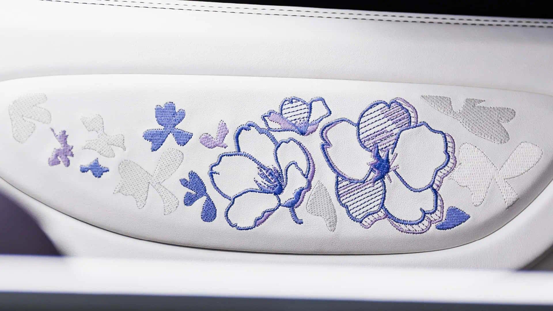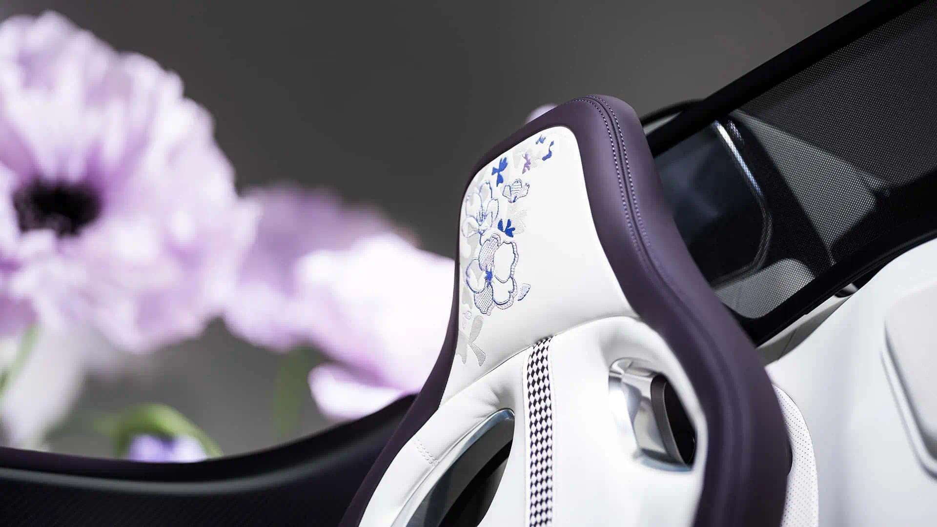 车内方面配资咨询平台,新车选用独特的“Blanc”白和“Minuit”双色皮革,搭配紫色点缀和碳纤维装饰。车内座椅头枕及门内衬应用多层次绣制花卉图案,以增添深度和动感。