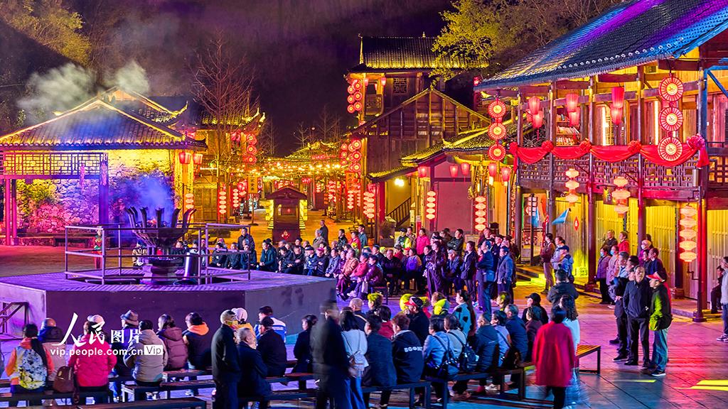 2026年3月24日晚,游客在湖北宜昌观看三峡车溪大型行浸式山水夜游演艺《梦回车溪》。该演出以车溪山水和土家集市为全景舞台,以浪漫爱情传说为主线,围绕“神、人、爱”三大主题,串联“神兽迎宾”“老街灯火”“十里红妆”等场景,将巴楚民俗文化与现代演艺科技深度融合。